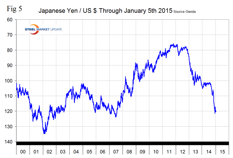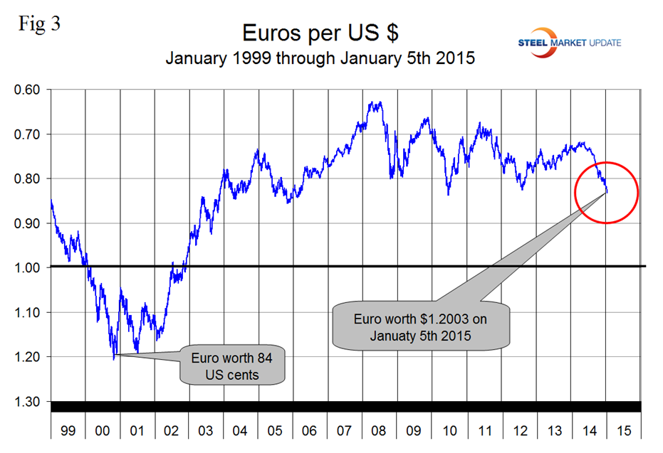 On September 6th the Euro broke through the 1.3 US $ / Euro level for the first time since July 11th last year and since our last report on December 11th when it closed at 1.2395 the currency has declined further to 1.2003. On January 5th the Euro stood at 0.8331 to the US$ and had declined by 4.1 percent in the last three months, (Figure 3). A devalued Euro means that US exports will be more expensive in Europe and European imports will be cheaper here. This is particularly true for steel trade. In addition European scrap will be more attractive to Turkish buyers than supplies from the US which will put downward pressure on domestic scrap prices.