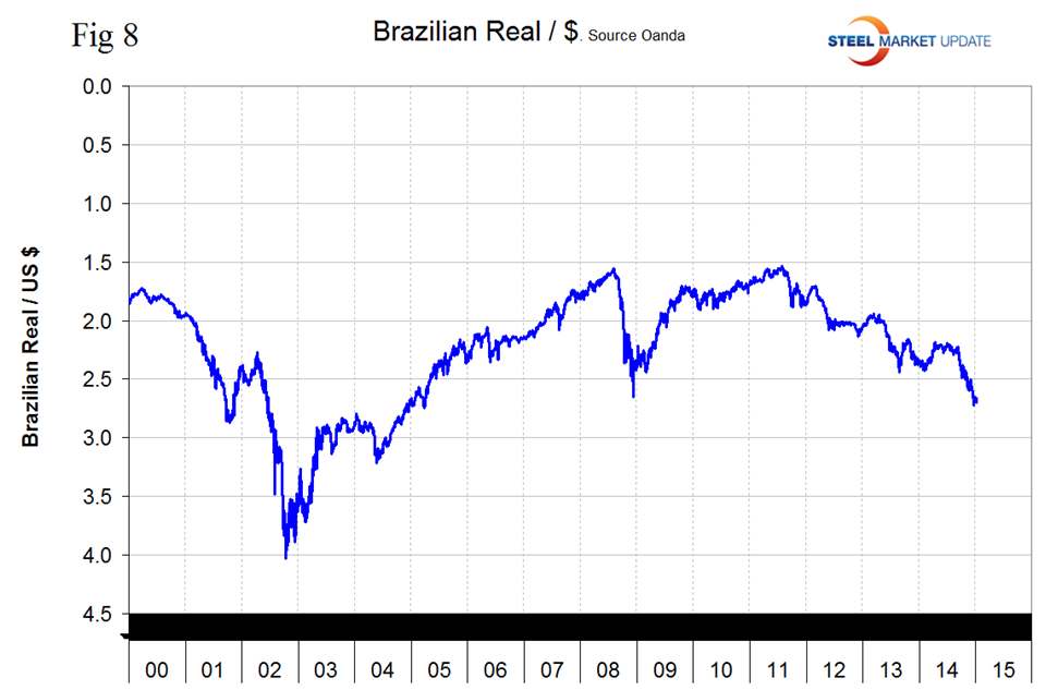 The reversal of the ‘carry-trade’ (borrow US$, buy something else higher yielding) has been well underway since the Fed announced last year that it would end QE3. Emerging country currencies have plummeted, together with commodity prices. Australian and Canadian commodity producers that borrowed heavily in USD have been doubly hit by a stronger US$ and plunging commodity prices, including iron ore, and their share prices have plummeted. The Australian $, (Figure 7) and Brazilian Real, (Figure 8) are being hit even harder than the Canadian $ in the last three months being down by 6.8 percent and 9.1 percent respectively.
