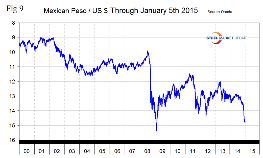 The Mexican Peso closed at 14.83 on January 5th, down by 9.08 percent in three months, and in free fall for all of December and into January, (Figure 9). The Peso has broken through the previous low point which occurred on June 6th 2012 and is now at its lowest point since March 16th 2009.