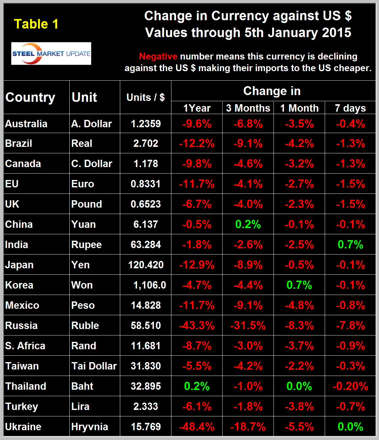 It does not necessarily follow that the currencies of the steel trading nations follow the Broad Index but this is currently the case. In the seven days through January 5th the dollar has strengthened against fourteen of the sixteen steel trading nations and weakened against two. Table 1 shows the number of currency units of steel trading nations that it takes to buy one US dollar and the change in one year, three months, one month and seven days. Negative values for change indicate that the dollar is strengthening against a particular currency. An explanation of the source data is given at the end of this piece. In the last twelve months the dollar has strengthened against 15 of the 16 currencies considered here, Thailand being the only exception. In the last three months the dollar has also strengthened against 15 of the 16 steel trading nation’s currencies, in this case China was the only exception. In the last month and week the dollar has strengthened against 14 of the 16 currencies considered here. Table 1 is color coded to indicate strengthening of the dollar in red and weakening in green. We regard strengthening of the US Dollar as negative and weakening as positive because the effect on net imports.