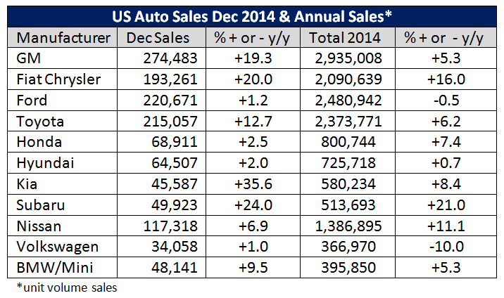 US automotive sales were positive across the board in December. Total sales for 2014 showed a vigorous auto industry aided by low gas prices, a recovering economy and higher employment. Total sales were reported to be 16,522,000 light vehicles.