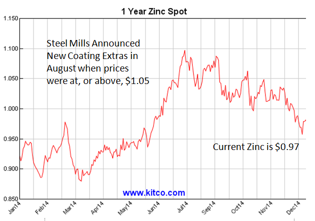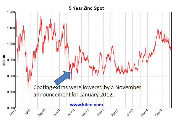 We went back to the last time the coating extras were adjusted (lowered) which was in November 2011. In late 2010 and through the summer 2011, zinc spot prices were bouncing between $0.95/pound and $1.15/pound. By early 4th Quarter 2011 the bottom had fallen out of the market and zinc prices dropped below $0.90/pound. The new, lower extras went into effect in January 2012 and remained constant until the changes announced this past year.