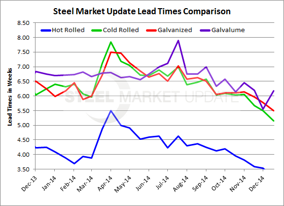 Based on the results of this weeks flat rolled steel market analysis, hot rolled lead times averaged 3.19 weeks, down one half a week compared to the beginning of December and one week shorter than what we saw the first week of January 2014.