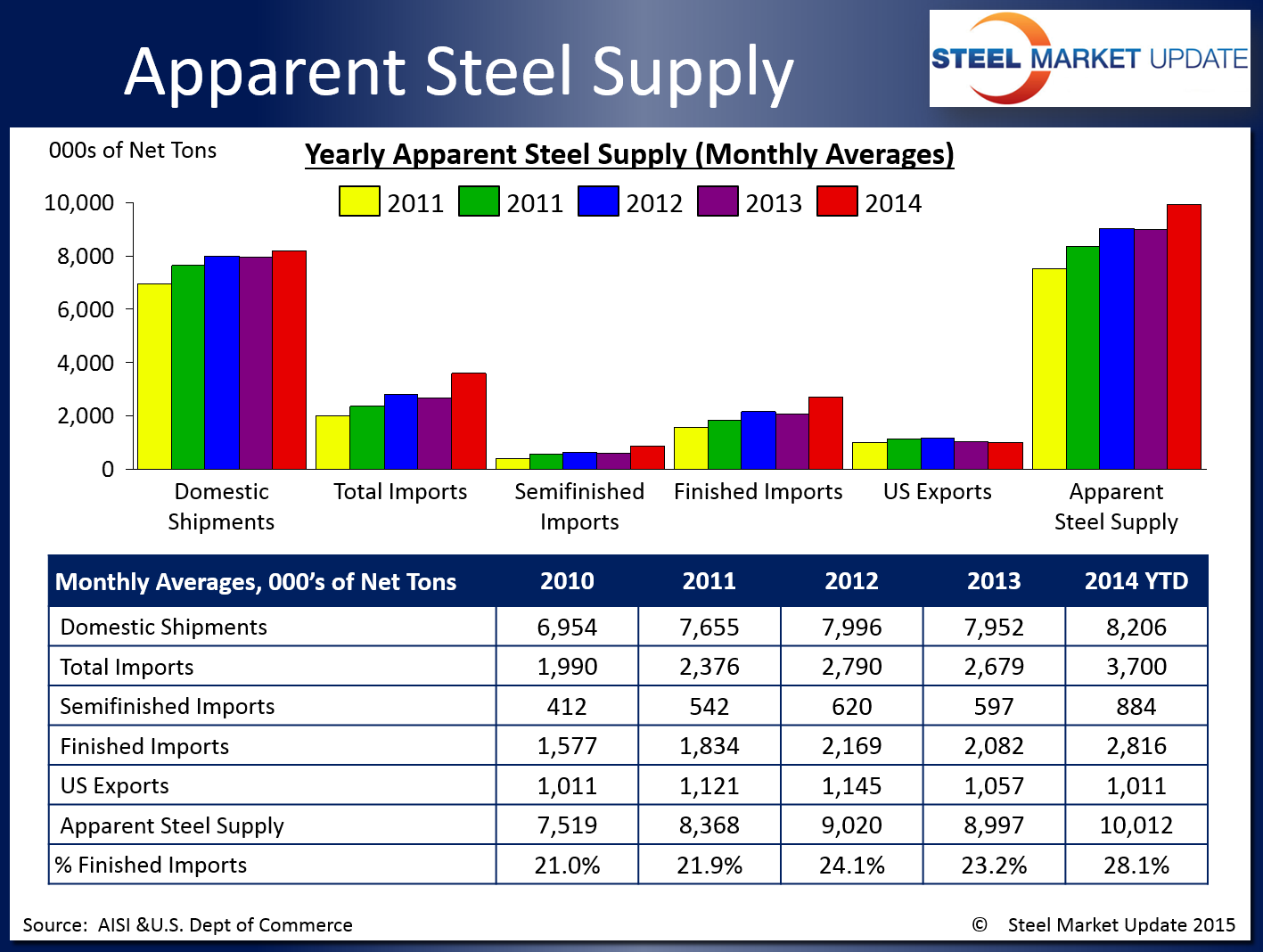 On a year to date basis (YTD), the 2014 averages remain above what we experienced during previous years, with the exception of total exports which have remained slightly down to steady. At this time, the U.S. is on pace to exceed 2013 apparent steel supply by approximately 12.5 percent.