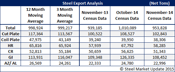 With the higher value of the U.S. dollar versus other steel trading nation’s currencies, we are seeing exports of steel in November as down slightly over October. November steel exports totaled 953,828 net tons (865,299 metric tons), down 5.6 percent over October but up 1.6 percent from November 2013 (all products). Here is a breakdown of flat rolled and plate exports for the month of November:
