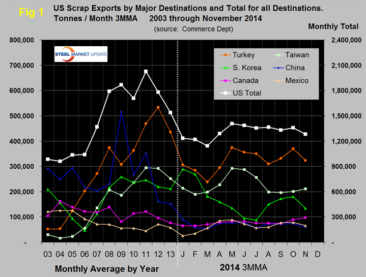 In the first eleven months of 2014, scrap exports totaled 14,251,000 tonnes (metric tons), down by 15.7 percent from the same period in 2013. In the single month of November exports were 1,347,000 tonnes, almost unchanged from October. Figure 1 shows that the three month moving average has been declining slightly for the last seven months though unusually consistent during that time and continued to be lower than the average in any year from 2008 through 2013.