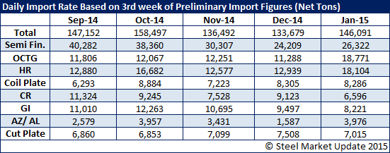 The U.S. Department of Commerce updated its import license data earlier today. January import levels continue to be at very high levels compared to November and December and very similar to what we saw in September when imports totaled 3.9 million net tons. The daily rate is about 10,000 tons per day higher than November when we saw total imports at 3.694 million tons. Based on this data through the 20th of January we believe total imports will come in between those two numbers – 3.694 to 3.9 million tons.