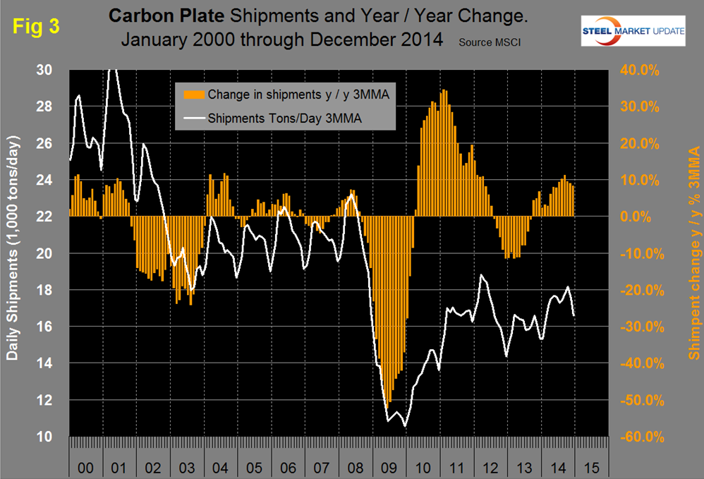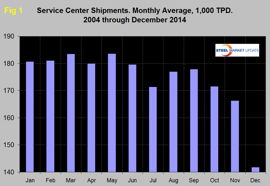 In the eleven years 2004 through 2014 December shipments on average have been 14.7 percent less than November. This year December was down 13.1 percent from November, we can expect January shipments to be up by 16.4 percent when the data is released next month. Figure 1 demonstrates the seasonality of service center shipments and why comparing a month’s performance with the previous month is usually misleading. For this reason in the SMU analysis we always consider year over year changes.