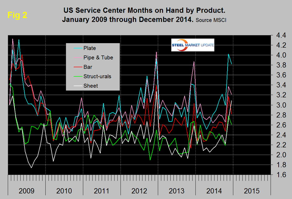 Almost all of the intake surplus in December was sheet products. Plate had a small surplus of intake as all other product groups took in less than they shipped. Months on hand (MoH) in total increased from 2.92 at the end of November to 3.13 at the end of December. Figure 2 shows the MoH by product since January 2009, all products declined except sheet which increased strongly.
