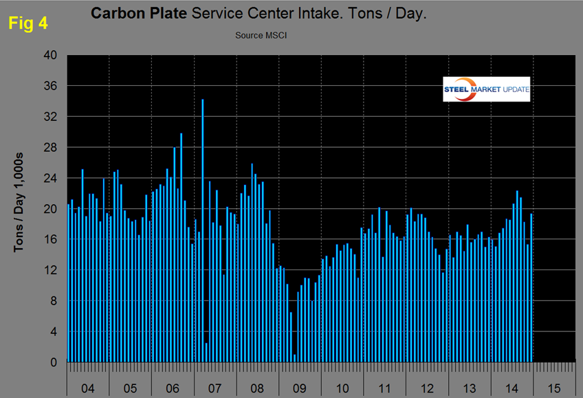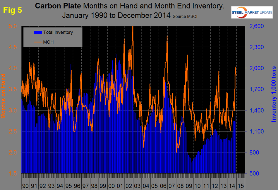 Figure 5 shows total inventory and MoH for plate since January 1990. There is always an end of year spike to MoH and 2014 was no exception.