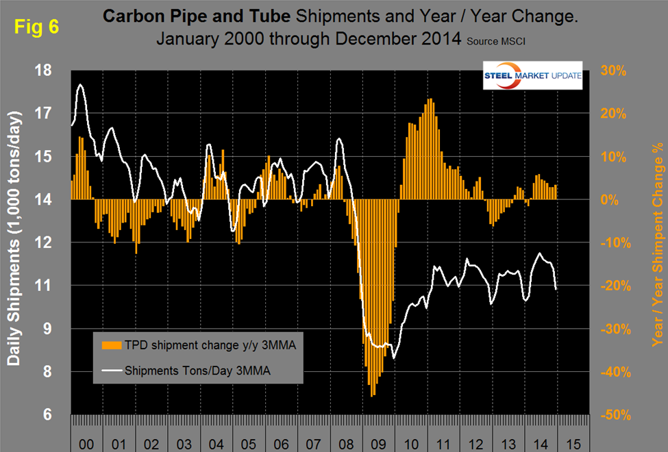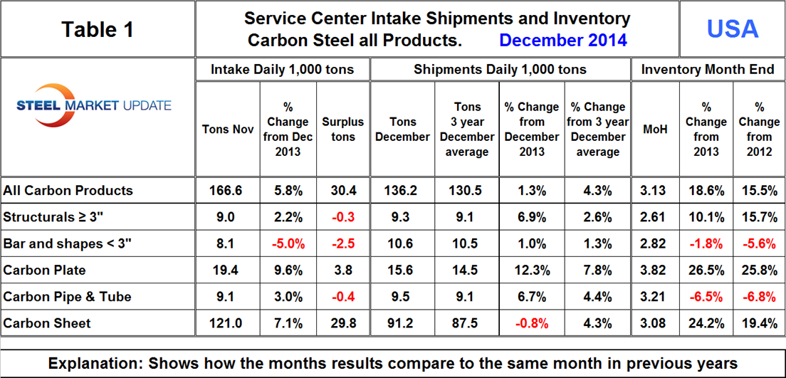 Table 1 shows the performance by product in December compared to the same month last year and also with the average t/d for December 2014, December 2013 and December 2012. We then calculate the percent change between December 2014, December 2013 and with the 3 year December average. We hope this give the best view of market direction. In December intake at 166,600 tons and exceeded shipments by 30,400 tons. Shipments of all products on a t/d basis were up by 1.3 percent from December last year and up by 4.3 percent from the average December shipments for 2014, 2013 and 2012. The fact that the single month growth comparison is lower than the three year comparison is an indication that momentum is negative and growth decelerated. This deceleration was almost entirely due to sheet products. Bars and light shapes has a slight negative momentum and plate and structurals advanced strongly. Pipe and tube had positive momentum, surprisingly given the state of the energy market.