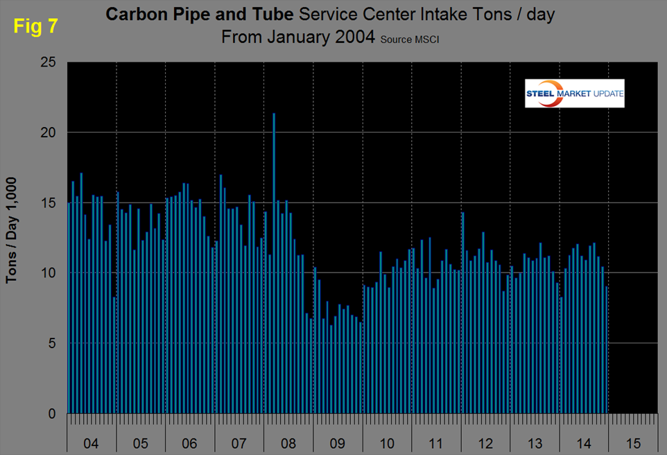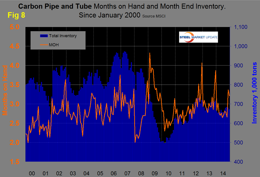 Figures 6, Figure 7 and Figure 8 show the same data for Pipe and Tube products. The growth of tubular shipments has been similar to that for total carbon products this year and considerably worse than for plate. Intake is also proportionately lower than plate. MoH of tubular goods did not spike in November to the same degree as plate but at year end was higher than all other carbon products.