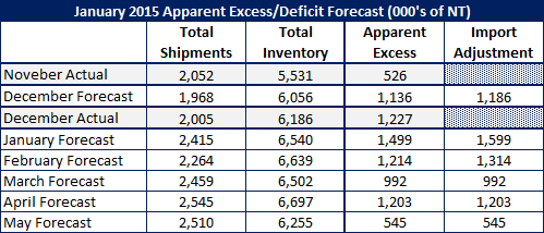 Receipts are projected to be up 5 percent during January 2015 vs. 2014. We have also made an inventory adjustment of 100,000 tons to accommodate excess foreign inventories. Total receipts for the month of January are forecast to be 2,769,500 tons.