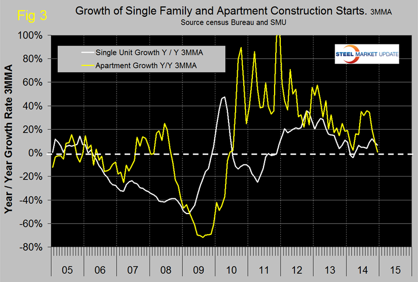 The decline in the growth rate of total starts is entirely reflective of the multifamily sector the growth of which has declined from 35.9 percent in August to 0.6 percent in December, 3MMA year over year. Single family growth by the same measure has ranged erratically between 4.0 percent and 12.1 percent, (Figure 3).