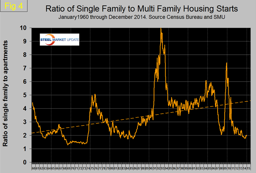 However the situation continues to be dramatically different for single and multi-family units. Single family permits were 57,000 less than starts and multi-family permits were 41,000 more than starts. This signals that the recent decline in multifamily starts is likely to be short lived and that the improvement in single family doesn’t have legs. The ratio of the two sectors is shown in Figure 4 and demonstrates that single family compared to multifamily has improved slightly but single family homes continue to be less desirable than at any time in the last 30 years. Based on permit data this trend will not change any time soon. Student loan debt exceeded $1.3 trillion in the 3rd Q of 2014 for the first time, this must be impacting the young person’s view of other debt obligations and so presumably is the view that housing is not necessarily the great investment that it was once thought to be. In addition uncertainty in the job market makes mobility desirable and promotes the idea of rent in preference to purchase. To attempt to counter these trends Fannie Mae and Freddie Mac have introduced a new program for first time buyers that require only a 3 percent down payment down from what has become the traditional 20 percent level since the subprime debacle. First time buyers normally account for 40 percent of new home sales. In this case first time is defined as not having held a mortgage for three years.