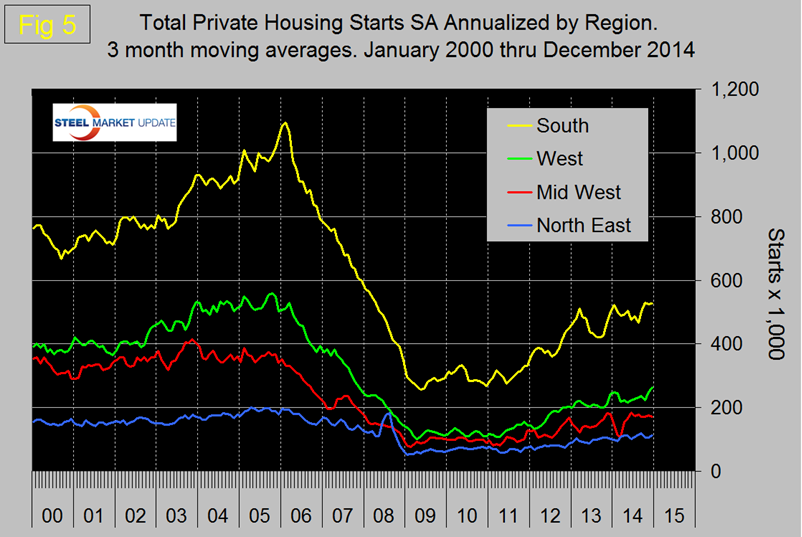 The situation in the four regions reported in the Census Bureau report was not synchronous in December. Total starts improved in all areas except the Mid-West. Single family starts improved in the South and West and declined in the Northeast and Midwest. The Northeast had the worst permit performance in three months through December. The Midwest and South both had a year over year decline in multifamily permits. Figure 5 shows the regional situation for total residential starts since January 2000.