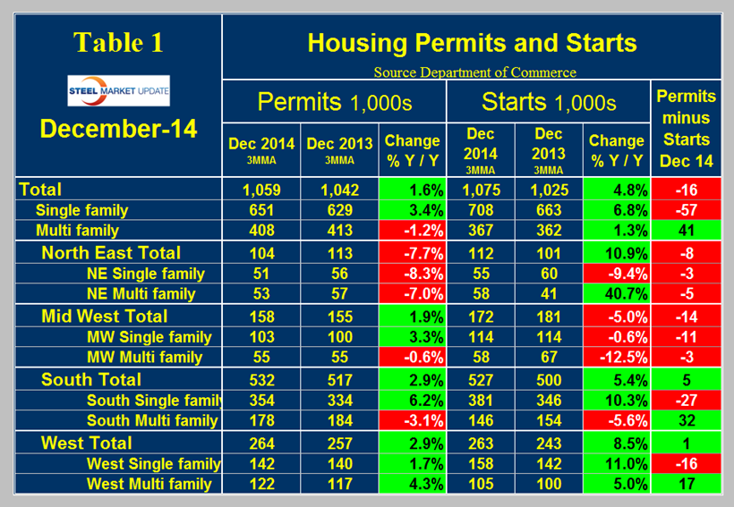 Permit data is useful to evaluate where future starts are headed. If permits exceed starts then we anticipate an acceleration and vice versa. Table 1 shows that total permits were 16,000 less than starts in December on a 3MMA basis.