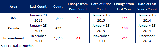 According to Baker Hughes data from January 23rd, 2015, the U.S rig count for this week is 1,633 rigs exploring for or developing oil or natural gas. This count is a decrease of 43 rigs when compared to last week, with oil rigs down 49 to 1,317 rigs, gas rigs up 6 to 316 rigs, and miscellaneous rigs unchanged at 0 rigs. Compared to last year the 1,633 count is a decrease of 144 rigs, with oil rigs down by 99, gas rigs down by 40, and miscellaneous rigs down by 5.