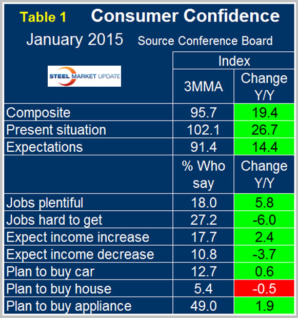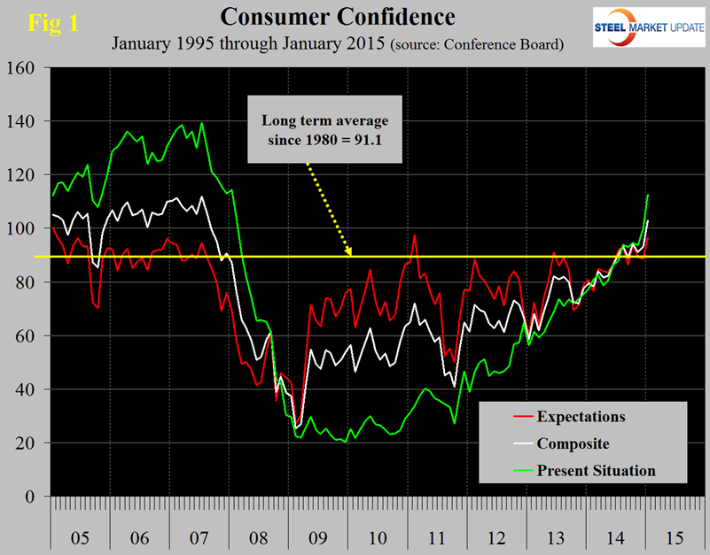 The consumer confidence index as reported by the Conference Board rose strongly in January and the December results were revised upwards. The composite rose from 93.1 to 102.9, the view of the present situation rose from 99.9 to 102.6 as expectations rose from 88.5 to 96.4. This was the first time for the composite to exceed 100 since September 2007 before the recession began. Interesting to realize that this indicator had a one year lead on the steel industry collapse in September 2008. The three month moving averages (3MMA) of the composite and present view and expectations all improved in January. The 3MMA of the composite at 95.7 is now well above the 35 year average which stands at 90.6 since 1980, the 3MMA of the composite, the view of the present situation and expectations are shown in Figure 1.
