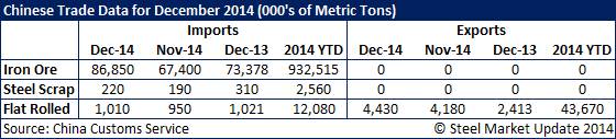 Chinese Iron Ore, Scrap & Flat Rolled Imports/Exports for 2014