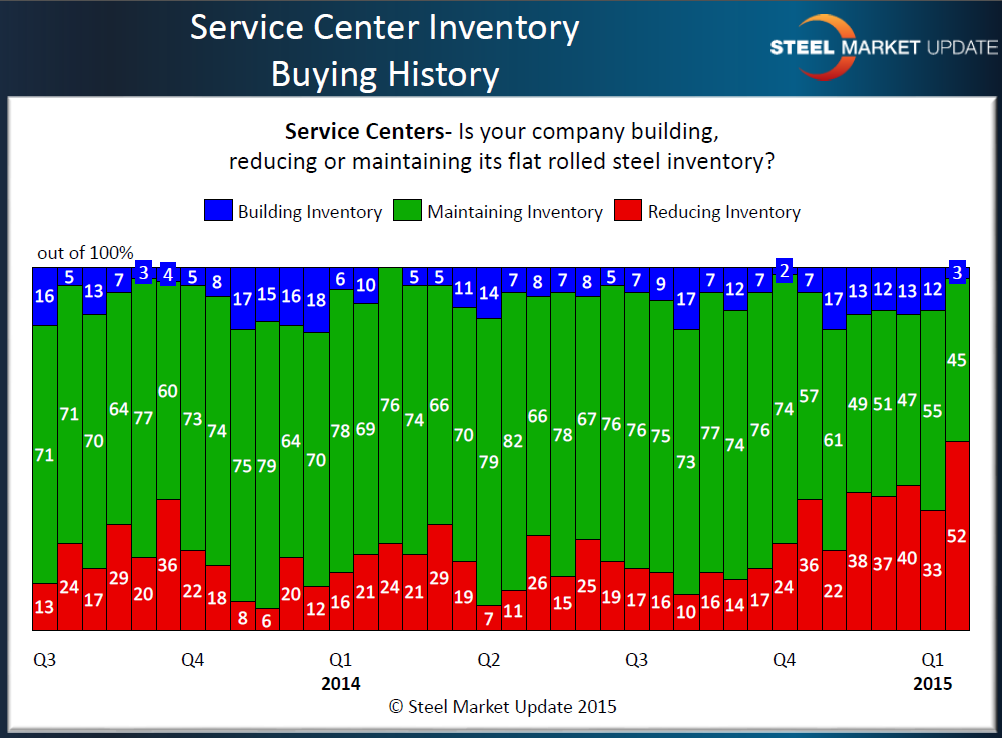 Last week Steel Market Update conducted one of our flat rolled steel market surveys. We asked both manufacturers and service centers whether they were reducing, building or maintaining inventory levels. What we discovered was the percentage of service centers moving into an inventory reduction mode had grown to 52 percent, up from 33 percent at the beginning of this month and well above the 24 percent recorded one year ago. Here is what that looks like on a historical basis (graphic taken from Power Point shared with our Premium level members):