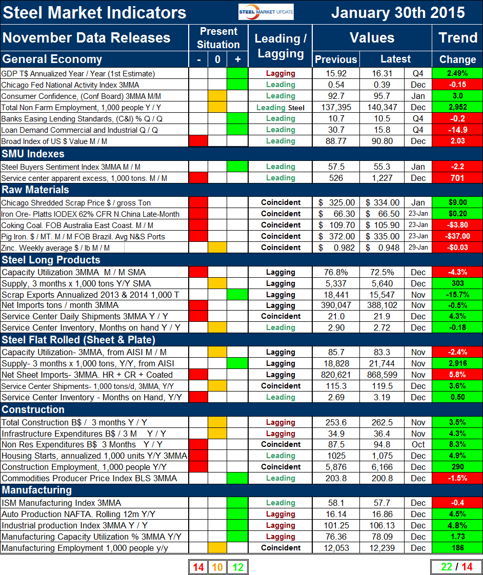 Explanation: The point of this analysis is to give both a quick visual appreciation of the market situation and a detailed description for those who want to dig deeper. It describes where we are now and the direction in which the market is headed and is designed to give a snapshot of the market on a specific date. The chart is stacked vertically to separate the primary indicators of the general economy, of proprietary Steel Market Update indices, of raw material prices, of both flat rolled and long product market indicators and finally of construction and manufacturing indicators. The indicators are classified as leading, coincident or lagging as shown in the third column.