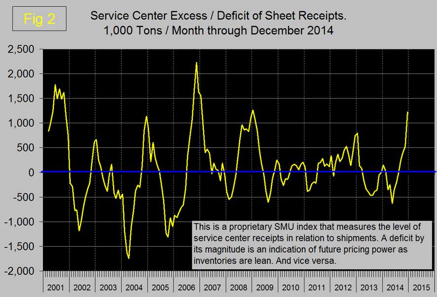The service center excess continued to be in surplus and in December exceeded a million tons for only the 4th time in 14 years. A surplus is regarded as a negative for prices going forward as it suggests that service center inventories are high. Figure 2 shows the progression of this index since January 2001.