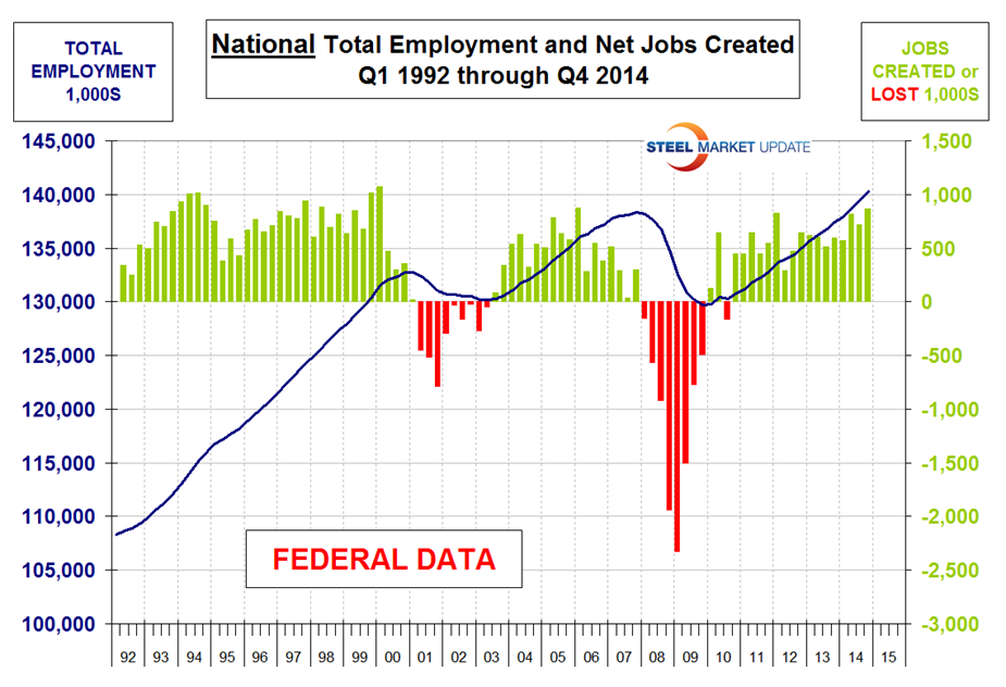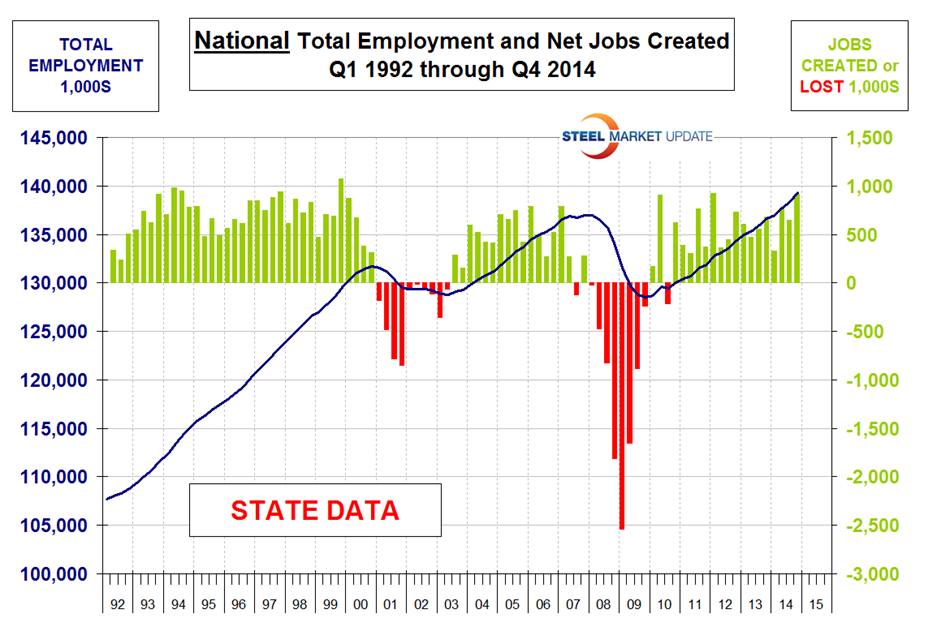 The states compile their employment numbers independently of the Feds then both are reported by the Bureau of Labor Statistics. The results are reasonably close with the Feds reporting total job creation in 2014 of 2,968,000 and the states reporting 2,664,000. Figure 1 and Figure 2 show the history of Federal and State totals since 1992. SMU has graphs in the same format for 10 geographic regions and can produce for individual states if a reader so requests.