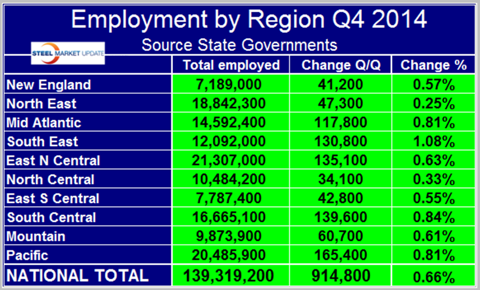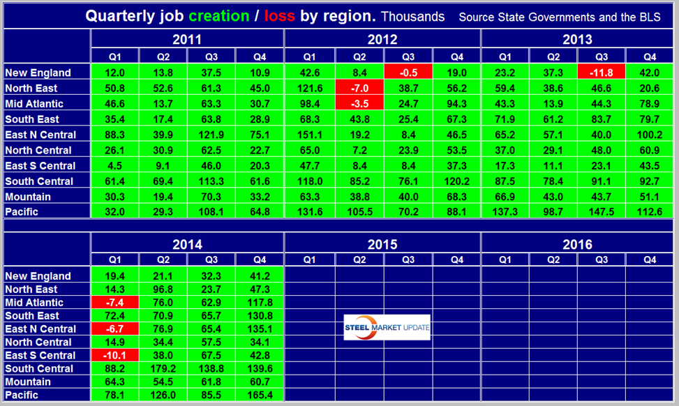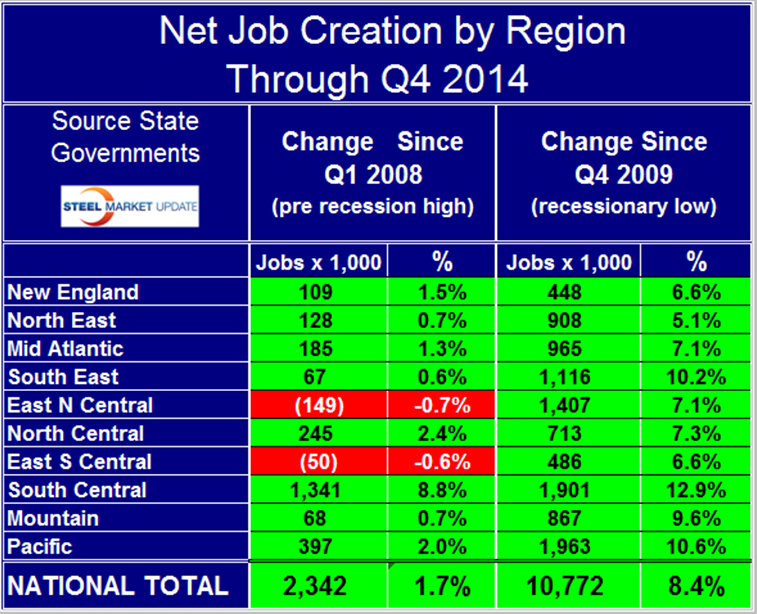 The regions have fared very differently since the pre-recession high of 1st Q 2008 and since the low point of Q4 2009. There are now 2,342,000 more people employed than there were immediately before the recession but of that number 1,341,000 jobs were created in the South Central, (TX, LA, AR and OK). The East North Central, (IL, IN, MI, OH and WI) and the East South Central, (AL, KEN, MIS, and TEN) have still not recovered all the jobs lost during the recession, (Table 2). In our Q3 analysis the South East, (FL and GA) were still in negative territory but their very strong Q4 put them over the top.