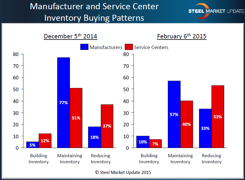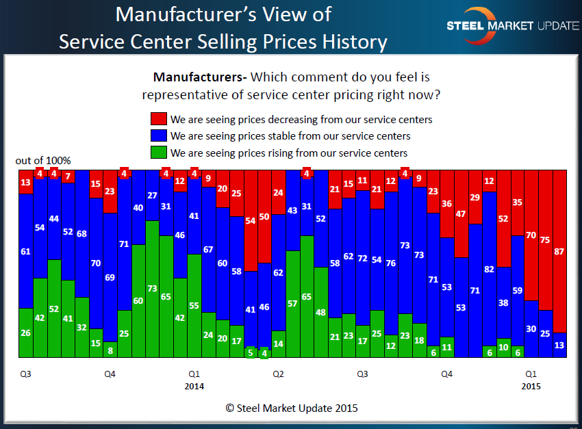 Those of you who have been reading Steel Market Update for an extended period of time know that we follow service center spot pricing both from a manufacturers and distributor perspective. The manufacturers have been reporting service center spot prices as dropping for a number of weeks. This past week 87 percent of the manufacturing companies responding to our survey reported distributor prices as falling up from 75 percent two weeks ago. In mid-December only 35 percent of the manufacturing companies were reporting falling service center spot prices.