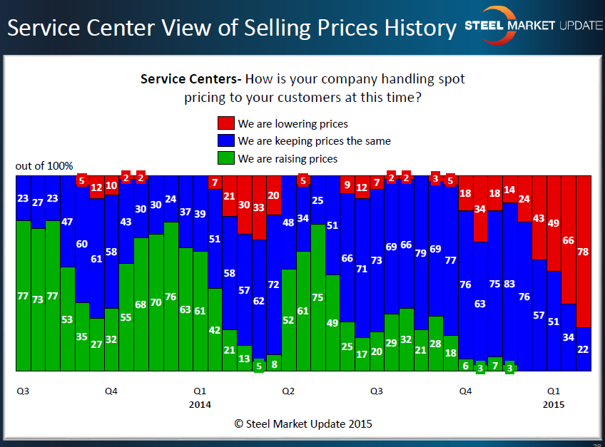 Perhaps the most telling graphic we have seen in awhile is that of the service centers who responded to our question as to how their company was handling spot pricing at this time. As you can see by the graphic below, spot prices are falling off a cliff as 78 percent of the distributors responding that their company was lowering prices. This is within the “capitulation” range we have spoken about previously. Capitulation is the point when virtually every service center decides they have to move inventory no matter what the cost in lost margin or cash flow. In the past, this was the time when the domestic mills have been able to announce price increases and turn prices into their favor.