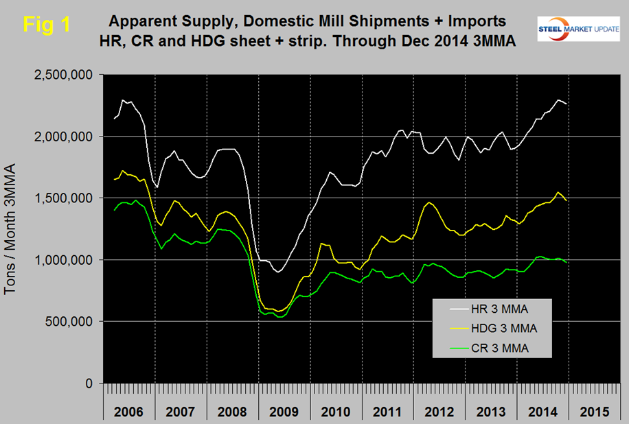 Figure 1 shows the long term supply picture for the three major sheet and strip products, HR, CR and HDG since January 2006. All three products are in higher demand than at any time since the recession. Hot band was range bound for 2.5 years until April 2014 when it broke out and advanced through October followed by a small decline in November and December. Cold rolled supply fell below a million tons at 974,560 tons in December (3MMA) after being above that threshold for six of the previous seven months. Prior to this recent past the last time cold rolled exceeded a million tons was in October 2008 as we prepared to go over the cliff. The increase in supply of cold rolled has not been as strong as hot band or HDG. Hot dipped galvanized had a strong bump in H1 2012, declined in H2 2012 and steadily improved for 22 months with a small decline in November and December. In three months through December the supply of HDG averaged 1,480,189 tons per month.