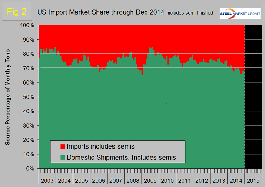 Figure 2 shows import market share of all steel products including semi-finished. There have been only three periods since 2003 when the domestic mills have commanded less than 70 percent of the market and of those three periods the current one is the most sustained.