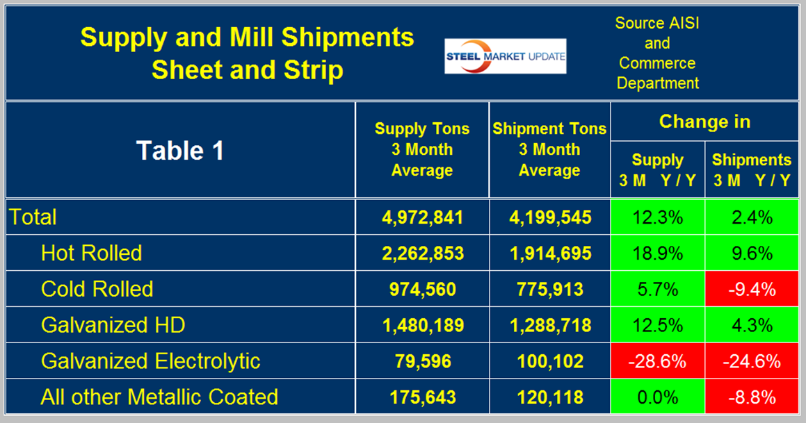 Last month we began to report on domestic mill shipments and total supply to the market in one single report to be able to compare side by side demand and the degree to which imports have absorbed that demand. Sources are the American Iron and Steel Institute and the Department of Commerce with analysis by SMU. This month we have continued to try to improve the comprehensive view.