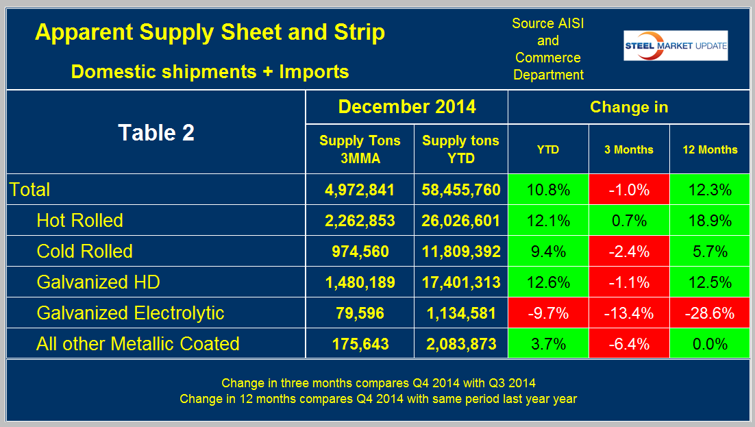 Apparent Supply is a proxy for market demand and is defined as domestic mill shipments to domestic locations plus imports. In Q4 2014 average monthly shipments of sheet and strip were 4,972,841 tons and for 2014 as a whole supply was 58,455,760 tons. Comparing 2014 with 2013 supply was up by 10.8 percent. Table 2 shows the change in supply by product YTD, it compares Q4 2014 with Q3 2014 and with Q4 2013.