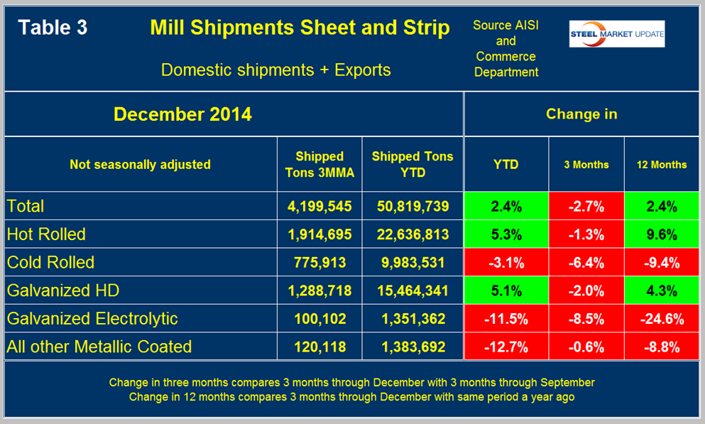 Mill Shipments: Table 3 shows that total shipments of sheet and strip products including hot rolled, cold rolled and all coated products were up by 2.4 percent YTD through December compared to the same period last year.