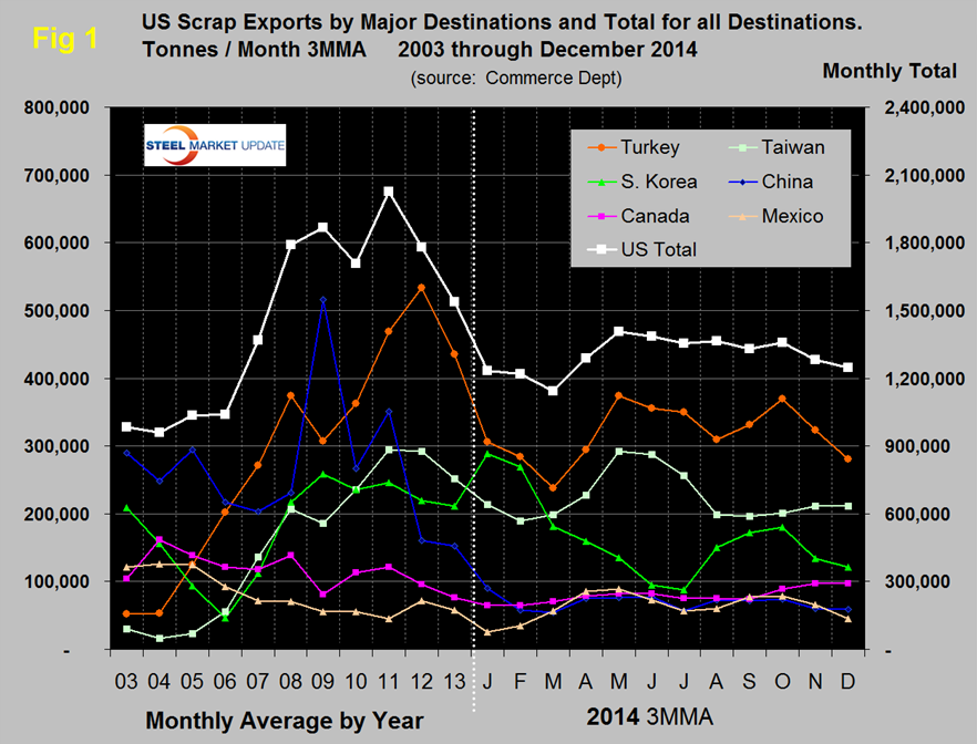 In the twelve months of 2014, ferrous scrap exports totaled 15,308,000 tonnes (metric tons), down by 17.1 percent from the same period in 2013. In the single month of December scrap exports were 1,056,570 tonnes, down 21.5 percent from November.