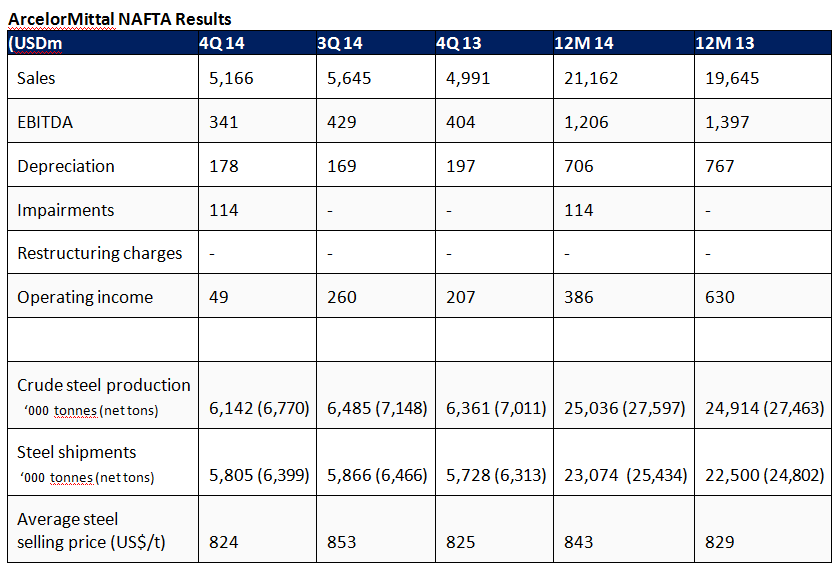 Consolidated steel shipments for 2014 were up 3 percent year over year to 85.1 million tonnes. Fourth quarter shipments decreased slightly to 21.2 million tonnes from 21.5 million tonnes in Q3.