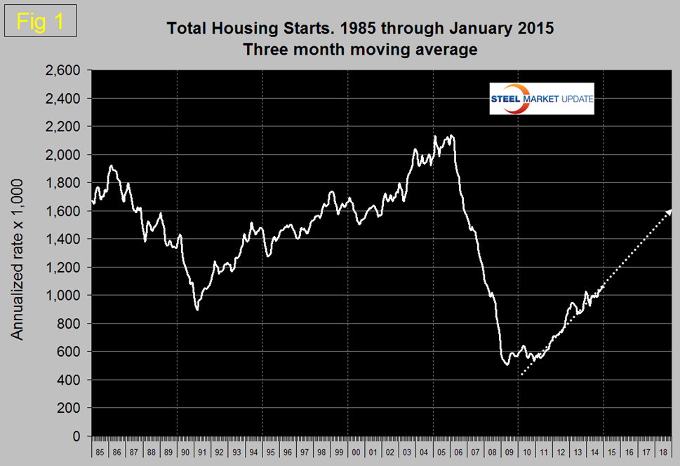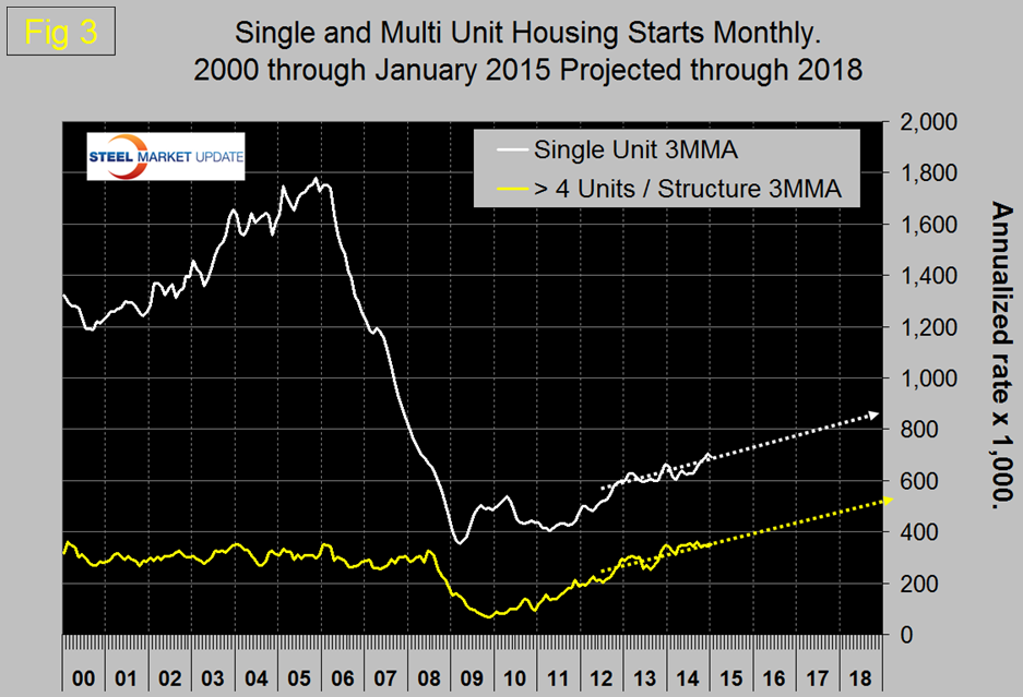 Housing starts in January declined by 22,000 annualized to 1,065,000 from 1,087,000 in December. This data is seasonally adjusted by Census department. The three month moving average (3MMA) fell to 1,056,000 but is still on a steadily improving trajectory, (Figure 1).