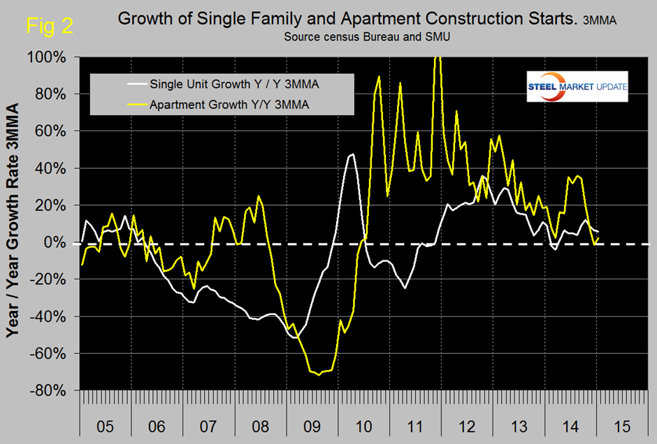Multifamily starts are now beyond the pre-recession high of January 2006 but the growth of starts in this sector has slowed dramatically from a 3MMA year over year of 35.9 percent in August to 2.2 percent in January, (Figure 2).