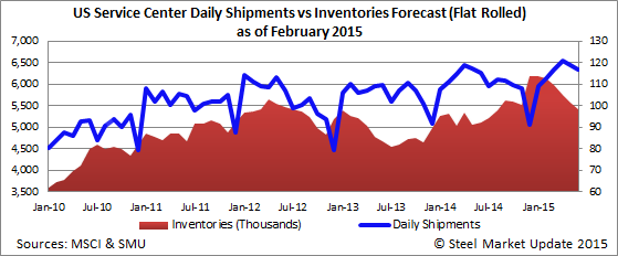 Steel Market Update last Apparent Excess/Deficit forecast for flat rolled steel shipments and inventories called for shipments in January to exceed 2014 levels by 2 percent. Total flat rolled shipments for the month of January 2015 were projected by us to be 2,415,000 tons. In actuality, shipment levels were 1.6 percent higher than January 2014 for a total of 2,295,500 tons according to the Metal Service Center Institute (MSCI) data released earlier this week.