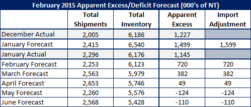 The graph below shows the change in the daily shipping rate and total inventory levels in a year over year comparison and out Apparent Excess model through our June 2015 forecast.