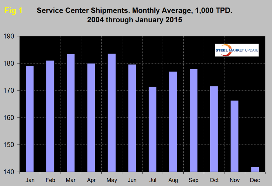 Steel Market Update last Apparent Excess/Deficit forecast for flat rolled steel shipments and inventories called for shipments in January to exceed 2014 levels by 2 percent. Total flat rolled shipments for the month of January 2015 were projected by us to be 2,415,000 tons. In actuality, shipment levels were 1.6 percent higher than January 2014 for a total of 2,295,500 tons according to the Metal Service Center Institute (MSCI) data released earlier this week.