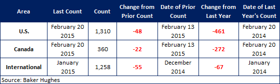 According to Baker Hughes data from February 20th, 2015, the U.S rig count for this week is 1,310 rigs exploring for or developing oil or natural gas. This count is a decrease of 48 rigs when compared to last week, with oil rigs down 37 to 1,019 rigs, gas rigs down 11 to 289 rigs, and miscellaneous rigs unchanged at 2 rigs. Compared to last year the 1,310 count is a decrease of 461 rigs, with oil rigs down by 406, gas rigs down by 53, and miscellaneous rigs down by 2.