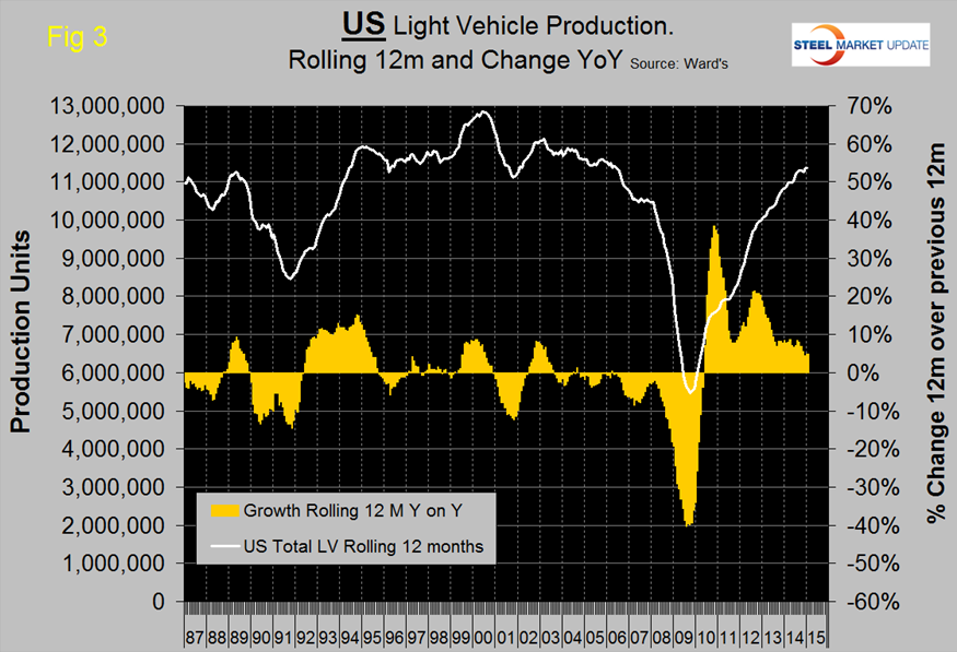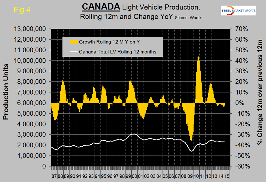 For NAFTA as a whole on a rolling 12 month basis year over year, light truck production was up by 8.5 percent and autos were unchanged. The following three graphs show the production and growth of light vehicles in the US, Canada and Mexico. (Figure 3, Figure 4, Figure 5).