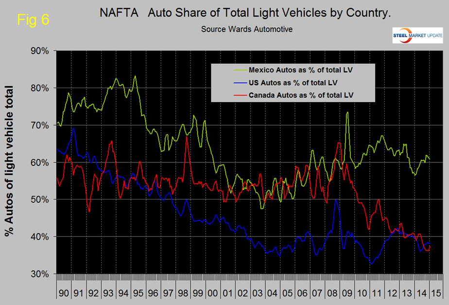The mix of light vehicles is very different by country (Figure 6). The percentage of autos in the Mexican mix in the last three months was 60.8 percent but only 38.0 in the US and 37.4 percent in Canada.