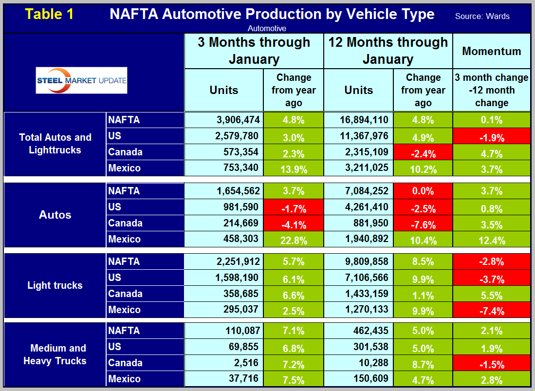 The vehicle sales year had a good start in January with 16.7 million units on a seasonally adjusted annualized basis. Light trucks are benefiting from lower gas prices and reached 55 percent of light vehicle sales, the highest since 2014. This is good for the US assembly plants because the US light truck production is much higher than autos, (see Table 1 below). Also auto imports are higher than light trucks so the increasing sales of light trucks benefits US assembly plants disproportionately. Import market share in January was 20.36 percent down from 21.3 percent in December.