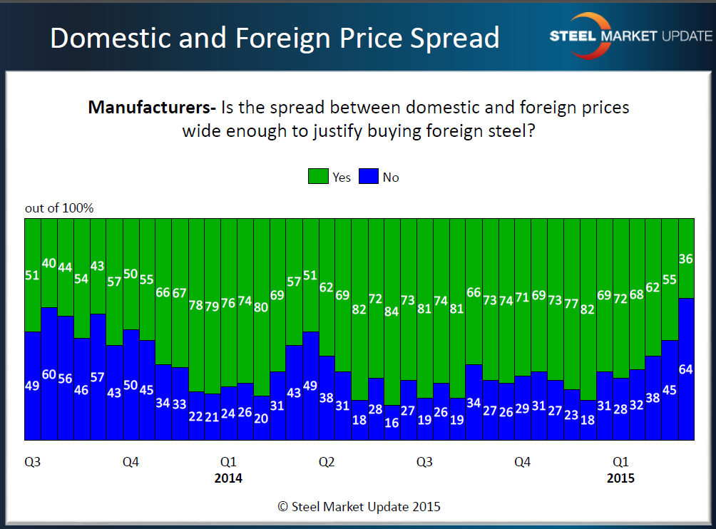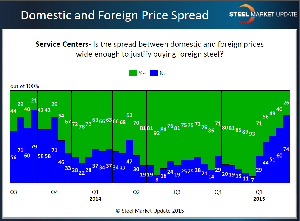 SMU mentioned above we have been keeping track of the spread between foreign and domestic steel pricing for quite some time. This has kept us on the cutting edge of changes as they occur. We want to watch the spread from both a manufacturing and service center perspective and the next two graphics will provide us some insights into the changes in the trend as both manufacturing companies and service centers become less enamored with foreign steel.