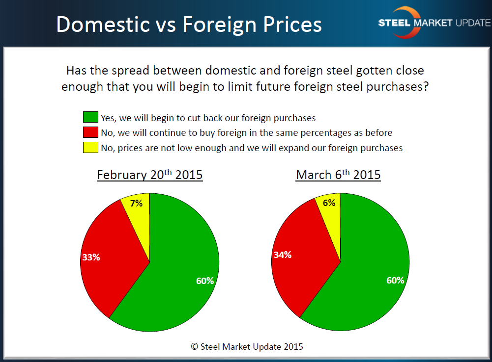 First, let’s look at the distributors who in the middle of December were reporting that the spread was wide enough to justify buying foreign steel. Now the vast majority have changed their minds with only 26 percent reporting.