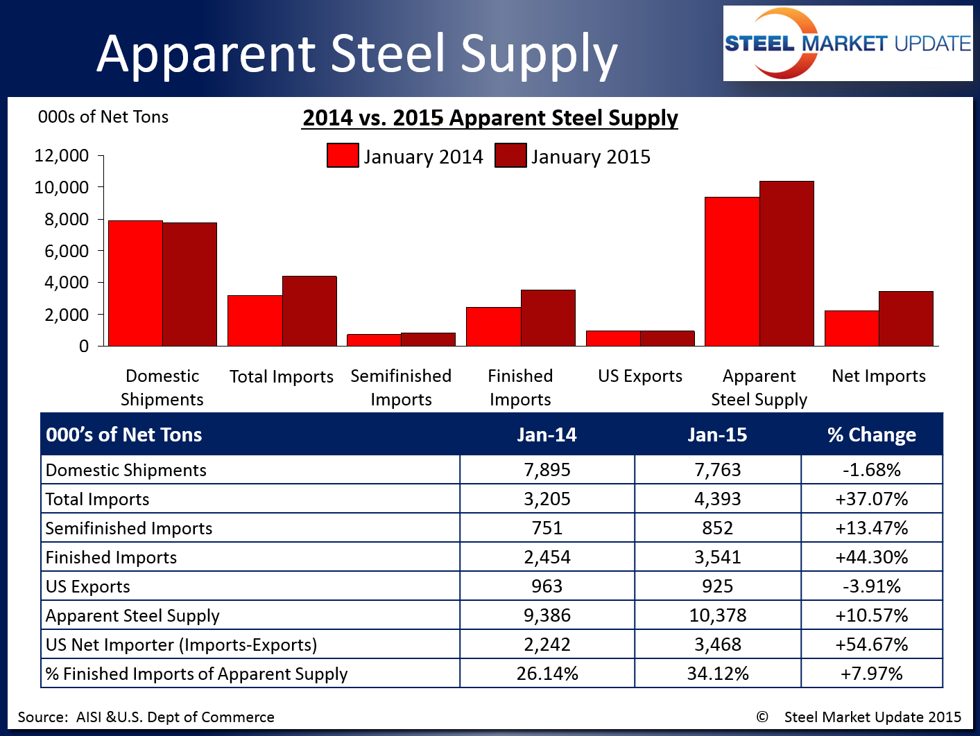 Apparent steel supply for the month of January 2015 was 10,378,392 net tons (9,415,130 metric tons). Apparent steel supply is calculated by adding domestic steel shipments and finished US steel imports and subtracting total US steel exports.